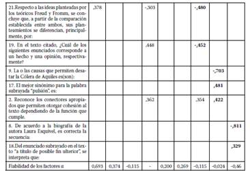 Factor 2: Las variables 3, 10 y 22 determinan el segundo factor; la primera variable tiene un peso superior a .7, y arriba de .5 en las últimas dos. La relación establecida entre los ítems radica en la creación de nuevos elementos en base al contenido del texto, por lo tanto, este factor se denomina “elaboración”. Los ítems de este factor apuntan a reformular la idea principal que se encuentra implícita, interpretar la secuencia de un microcuento, cuya tipología textual es compleja; y finalmente, aplicar los conocimientos previos del lector para identificar el proceso intertextual.
