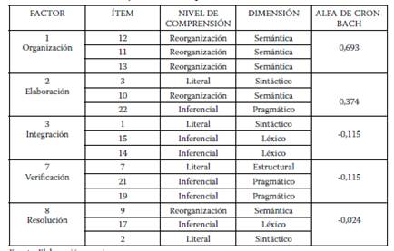 Al asociar este factor con los niveles y dimensiones de comprensión, se puede señalar que: de las tres variables, solo dos coinciden en nivel y dimensión, los ítems 21 y 19 comparten el nivel Inferencial y la dimensión Pragmática, no obstante, la variable 7 corresponde al nivel Literal y a la dimensión Estructural. Este factor obtiene un coeficiente Alfa de Cronbach de -.115.