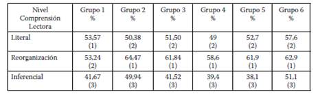 En la siguiente tabla se evidencia que el 17% de los consultados, correspondiente al grupo 1, respondió a la complejidad progresiva en comprensión lectora.