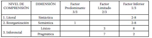 La tabla evidencia que el factor 1 se relaciona de manera directa con el segundo nivel planteado por Barret: Reorganización respondiendo a la dimensión semántica; mientras que los factores 3 y 7 se corresponden parcialmente con el tercer nivel Inferencial, con las dimensiones de Léxico y Pragmática, respectivamente, lo que se condice con lo propuesto por Manzanal et al. (2016). Finalmente, los factores 2 y 8, levemente responden a los tres niveles de comprensión siendo pluridimensionales.