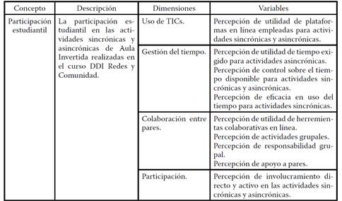 La “clase invertida” está orientada a aumentar la motivación y compromiso de los estudiantes, particularmente en contexto de educación remota (Fisher et al., 2018). Numerosos estudios (Sergis et al., 2018; Su y Chen, 2018; Zainuddin y Halili, 2016) han entregado evidencia que indica que el uso de la metodología Aula Invertida en estudiantes de educación superior mejora consistentemente la motivación y participación estudiantil en los cursos de diversas disciplinas. La participación estudiantil es considerada como el pilar de la metodología, entendida como un estado mental positivo que mejora la predisposición al trabajo, caracterizado por altos niveles de energía, concentración e inmersión, como así también un concepto multidimensional que involucra procesos afectivos, psicológicos y cognitivos (Mandernach, 2015; Medrano et al., 2015). La Tabla 1 presenta la operacionalización del concepto de Participación Estudiantil ocupado en este estudio: