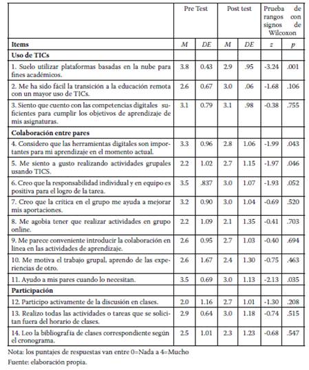 Los ítems están presentados en tres bloques según como fueron consultados. En el primer bloque, referido al uso de las TICs, solo existe diferencia estadísticamente significativa en relación a la frecuencia de uso de plataformas en la nube para fines académicos (z=-3.24; p=001), donde paradojalmente, los estudiantes presentan un puntaje más alto en la medición inicial. En los otros dos ítems de este bloque no existen diferencias estadísticamente significativas entre los dos momentos de la evaluación.