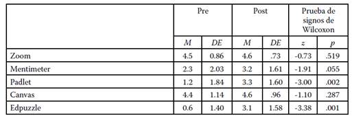 Se empleó el mismo procedimiento descrito anteriormente para poder comparar las mediciones antes después la valoración de utilidad que los estudiantes hacen de distintas herramientas. En este caso, la valoración de utilidad de todas ellas fue más alta en la medición post que en la medición pre, siendo Zoom y Canvas las mejores evaluadas, sin embargo, existen diferencias estadísticamente significativas solo en la valoración que se hace de Padlet (z=3.00; p=002) y Edpuzzle (z=-3.38; p=001). Los resultados de dicha comparación se presentan en la Tabla 4.