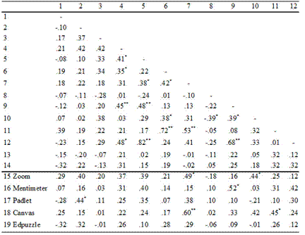 Como se puede apreciar, en general se observan correlaciones bajas y moderadas entre los distintos ítems evaluados, en general la mayoría son directas. Sin embargo, algunas correlaciones son inversas (ítem 5, ítem 9, ítem 12), y corresponde a que en la evaluación post responde con una calificación más baja que en la evaluación inicial. A su vez entre las herramientas que muestran mayor estabilidad entre estas dos dimensiones son el uso de zoom y canvas.