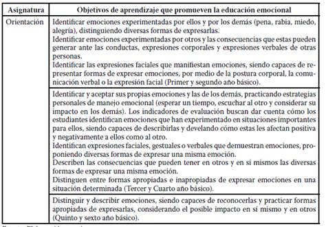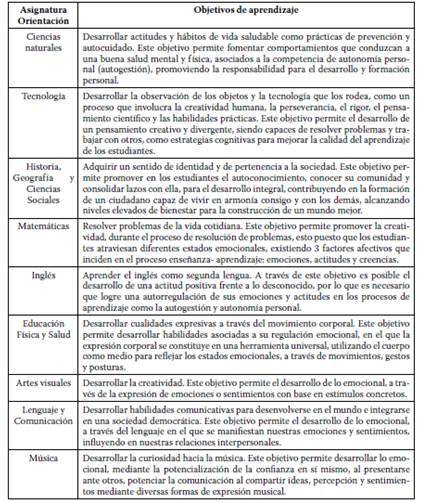 El análisis de contenido aplicado a las Bases Curriculares de las asignaturas de Artes Visuales, Ciencias Naturales, Educación Física y Salud, Historia Geografía y Ciencias Sociales, Inglés, Lenguaje Comunicación y Literatura, Matemáticas, Música, Tecnología y Orientación, nos permite constatar que solo en Orientación se incorporan objetivos de aprendizaje sobre la educación emocional. Estos objetivos se presentan en la Tabla 1.