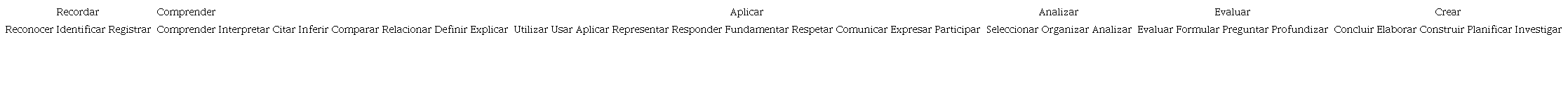Para el siguiente análisis se clasificaron respectivamente en las tablas Nº1, Nº2, Nº3, Nº4, Nº5 y Nº6 según las categorías taxonómicas elaboradas por Bloom et al. (1956), Anderson et al. (2001) y Marzano y Khendall (2007), todos aquellos términos que denoten una acción propuesta para ser ejecutada por las y los estudiantes, y que se establecen en las Bases Curriculares como Habilidades y Organizadores Temáticos a desarrollar en séptimo básico. En función de dicha clasificación, se extrajeron de los enunciados y destacaron en negritas, todos aquellos verbos que se alejan de una dinámica procedimental exclusivamente racional e individualista y obedecen a una lógica más bien inclusiva de lo sensible y colaboracionista.