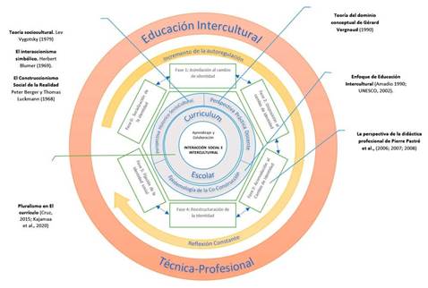 Para lograr esa meta, nuestro modelo conceptual, apoya sus bases en la interculturalidad educativa, los aportes de la psicología cognitiva, la psicología socio histórico cultural (Pastré et al., 2007, 2008; Vergnaud, 1990; Vygotsky, 1978) y la sociología (Berger y Luckmann, 1968; Blumer, 1969) como caminos sinérgicos y confluyentes, que pueden guiar a la reflexión. Abordamos esta necesidad, especialmente, en un momento, en que a la crisis actual por la pandemia de COVID-19 nos invitó a repensar la educación del ayer, del hoy y del futuro (Comisión Económica para América Latina y el Caribe - CEPAL, 2020; Murillo y Duk, 2020). De esta forma, dichas tradiciones aportan a una reflexión constante, facilitando y contribuyendo al desarrollo de la competencia intercultural y la colaboración continua en el contexto educativo formal. El modelo, desde sus dimensiones, permite profundizar en la identidad personal y colectiva, estimulando un cambio actitudinal, progresivo y autorregulado, que se construye desde una mirada de acción diversificada para la búsqueda de una pedagogía reflexiva (Vanegas Ortega y Fuentealba Jara, 2019), que se sostiene a la base de valores, saberes y conocimientos interculturales. Por lo tanto, sostenemos que, de esta manera, se puede responder a la urgente necesidad de situar a la educación técnica profesional, para que avancen hacia una perspectiva de diversidad social y cultural en la educación.