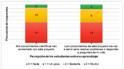Para conocer las percepciones del alumnado en torno a su aprendizaje se administró un cuestionario de elaboración propia, a través de Google Form, que constaba de dos preguntas: (I) Mis conocimientos científicos han aumentado en esta experiencia y (II) Los conocimientos de esta experiencia me van a servir para resolver problemas o responder a preguntas de mi vida, que los estudiantes debían valorar en una escala Likert de cuatro puntos (donde 0 = nada; 1 = un poco; 2 = bastante; 3 = mucho).