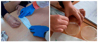 Toma de muestras de la mascarilla usada. Se pretendía que el alumnado aprendiese a tomar muestras biológicas adecuadamente. Cada grupo empleó una mascarilla que había sido usada por un estudiante de su grupo. El alumnado se higienizó las manos con solución hidroalcohólica y, luego, tomó la muestra con un bastoncillo mojado en dilución del propio medio de cultivo para favorecer el arrastre de microorganismos (Figura 2, izqda.).