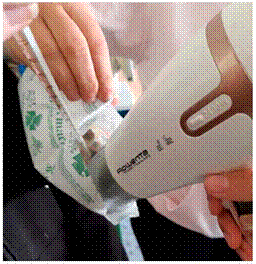 Para la experiencia con calor seco la esterilización se llevó a cabo introduciendo la mascarilla en una bolsa de papel estéril de farmacia y utilizando el secador de pelo descrito en la Tabla 1, de tal forma que el calor llegase a la mascarilla por convección (Figura 4). Dos estudiantes del grupo controlaron el tiempo de aplicación (10 s) y la temperatura alcanzada introduciendo un termómetro en el interior de la bolsa, que en todos los casos estuvo en torno a 100 ºC.