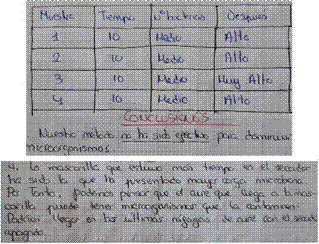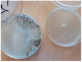 Elaboración de conclusiones. Cada grupo elaboró sus conclusiones tras el estudio a partir de los datos cualitativos de carga microbiana y posteriormente fueron compartidas con el resto de compañeros en una puesta en común y anotadas en la pizarra. Para el proceso de esterilización con luz UV-C concluyeron que el protocolo era efectivo, como se observa en la Figura 5, al detectarse una disminución evidente de la carga microbiana tras el proceso (Figura 7). Asimismo, indicaron que la esterilización con calor seco no era efectiva (Figura 6), ya que la carga microbiana detectada tras el proceso fue mayor. Esto indujo a pensar a los estudiantes que el aire que llegaba a través del secador introducía de alguna manera una mayor cantidad de microorganismos en las mascarillas (Figura 8). Los estudiantes, confirmaron de esta forma las hipótesis 2 y 3 planteadas.