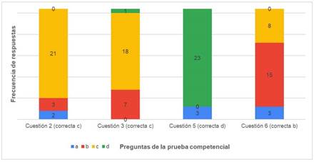 La Figura 9 recoge la frecuencia de estudiantes en cada opción para las distintas cuestiones de elección múltiple.