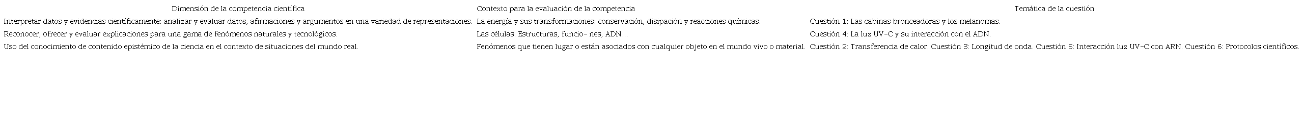 Esta actividad tomó como referencia las pruebas de evaluación de diagnóstico de PISA (OCDE, 2018). El objetivo de esta actividad fue evaluar el desempeño de competencias científicas desarrolladas en la experiencia, dando respuesta de esta forma a la hipótesis 1 planteada. La actividad planteaba seis cuestiones que abordan las tres dimensiones de la competencia científica propuestas por PISA para algunos de los contextos recomendados para la evaluación (tabla 3). Las cuestiones completas se recogen en el anexo. Se incluyeron dos tipos de cuestiones: de respuesta abierta (cuestiones 1 y 4) y de elección de respuesta múltiple con cuatro opciones (cuestiones 2, 3, 5 y 6). Las cuestiones 1 y 2 estaban precedidas de un texto (texto 1, anexo) y de dos gráficas, mientras que las cuestiones 3 a 6 estaban relacionadas con un segundo texto (texto 2, anexo). Ambos textos y gráficas debían utilizarse para extraer información relevante que permitiría a los estudiantes responder adecuadamente a las cuestiones planteadas.
