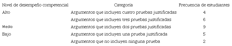 Para el análisis del nivel de desempeño competencial, se consideró nivel alto aquellos argumentos que incluían tres o cuatro pruebas bien justificadas, mostrando que el estudiante había sido capaz de identificar y analizar datos complejos en la información suministrada y utilizarlos para construir un argumento. Se consideró como nivel competencial medio, argumentos con dos pruebas que explicaban el fenómeno de una manera menos justificada. En el nivel bajo se incluyeron argumentos que aportaban una o ninguna prueba, y, por tanto, se trataba de respuestas que simplemente recordaban un concepto o término.