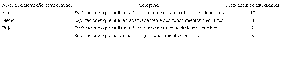 La Tabla 5 recoge el desempeño competencial del alumnado en la dimensión reconocer, ofrecer y evaluar explicaciones de un fenómeno natural. Como se aprecia, la mayoría de los estudiantes (17/26) son capaces de realizar explicaciones que utilizan de forma adecuada tres conocimientos científicos (nivel competencial alto), mientras que pocos estudiantes utilizan explicaciones apoyadas en dos conocimientos (nivel medio) (4/26), uno o ninguno (5/26) (nivel bajo).
