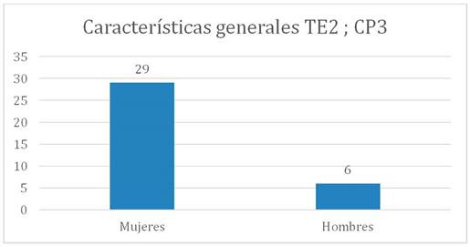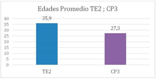 Los grupos de participantes estuvieron predominantemente compuestos por mujeres (Figura 1), lo que es coherente con la composición por género del gremio docente en Chile, cuyo 70% está conformado por mujeres (De Los Ríos y Valenzuela, 2013, p. 64). Asimismo, cabe señalar que la prevalencia de enfermedades vocales difiere según sexo biológico. Por ejemplo, en el femenino, la patología vocal de los nódulos vocales tiende a ser más frecuente (Cobeta et al., 2013), por ende, su abordaje puede ser distinto, no así su prevención. En cuanto a su promedio etario, los participantes de TE2 son mayores que los de CP3 (Figura 2), lo que se entiende por el hecho de que a esta última instancia asistieron más estudiantes de Pedagogía que profesores(as) en ejercicio, como se observa en la Figura 3.