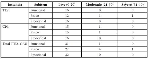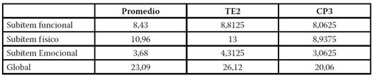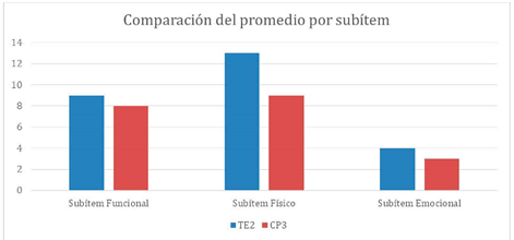 En cuanto a la aplicación del VHI-30, de un total de 32 encuestas respondidas por los participantes de las instancias TE2 y CP3, se obtuvo que el puntaje global promedio fue de 23,09, siendo el subítem físico el con mayor puntaje promedio (Tabla 4). También se pudo observar que existe una diferencia entre ambas instancias respecto al promedio de sus puntajes totales y por subítem, siendo el grupo 2 el que promedió puntajes mayores (Figura 10).