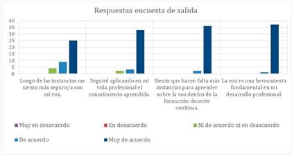 En cuanto a las respuestas, los participantes demuestran estar “muy de acuerdo” o “de acuerdo” respecto a sentirse más seguros con sus voces y a seguir aplicando lo aprendido, en su vida profesional. Se identifica, además, la falta de instancias para aprender sobre la voz dentro de la formación docente continua, reconociendo finalmente que la voz es una herramienta fundamental en el desarrollo profesional de cada uno/a.