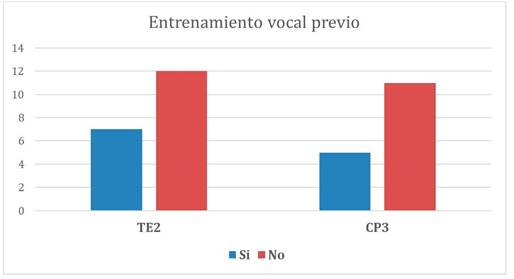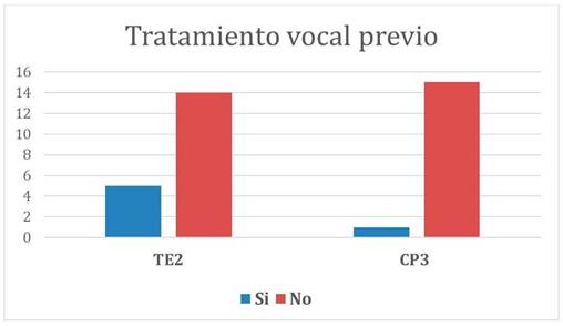Llama la atención el bajo número de tratamientos vocales previos en ambas instancias, aun cuando en TE2 es un tanto más elevado en número de personas que lo han tenido.
