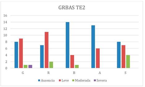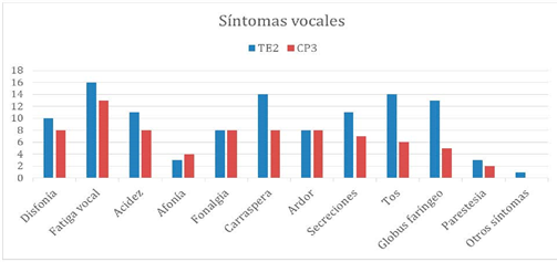 De acuerdo con la figura 6, los síntomas vocales presentados en la evaluación clínica por los participantes son mayores en TE2, en especial en lo que respecta a la disfonía, fatiga vocal, acidez, carraspera, la existencia de secreciones, tos y globus faríngeo. Existen escasos reportes de afonía, parestesia y otros síntomas en ambos grupos.