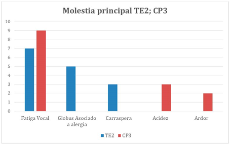 Los participantes, por su parte, reportan mayoritariamente como molestia principal la fatiga vocal (Figura 7), lo que es coincidente con la evaluación clínica. Cabe indicar que el grupo asistente a TE2 reporta además globus y carraspera, a diferencia del grupo asistente a CP3, quienes junto con la fatiga vocal manifestaron tener acidez y ardor.
