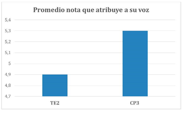 De acuerdo a la figura 8, se puede apreciar una diferencia en la autopercepción de la calidad de la voz entre grupos TE2 y CP3, siendo menor en el caso de TE2, lo cual se podría explicar debido a su composición particular. A pesar de lo anterior, ambos grupos poseen un promedio menor a 6 sobre su calidad vocal.
