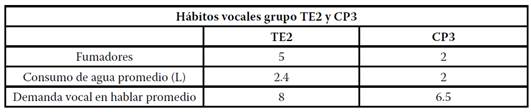 Tabla 3 Hábitos vocales grupo TE2 y CP3: Fumadores, consumo de agua, Horas de uso estimada. En esta tabla se aprecian los datos respecto a hábitos. Destaca la diferencia en el promedio elevado en cuanto a consumo de cigarrillos diarios en el TE2; consumo de agua en promedio más elevado en TE2 al igual que la demanda vocal promedio.