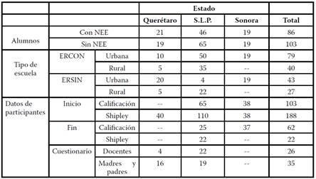 El objetivo general del presente estudio es identificar el rendimiento académico de alumnado con y sin NEE que asiste a escuelas regulares integradoras y no integradoras consideradas como instituciones con experiencias exitosas, en contextos rurales y urbanos. El proyecto se desarrolló en Querétaro, San Luis Potosí y Sonora, México. Los objetivos específicos fueron: