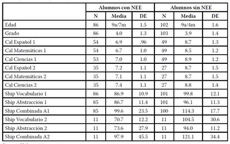 Se hicieron comparaciones intergrupos de medias independientes de las calificaciones de la Shipley aplicada al principio entre alumnos con y sin NEE. Todas las comparaciones mostraron diferencias estadísticas significativas a favor de los alumnos sin NEE (vocabulario: t= -7.63, gl= 113, p≤ .000; abstracción: t= -6.25, gl= 126, p≤ .000 y combinada A, t= -4.44, gl= 130, p≤ .000). Además, se compararon los puntajes intragrupos (iniciales/finales) de los alumnos con y sin NEE en la Shipley. Solamente se encontraron diferencias significativas para los alumnos con NEE en el puntaje final de Vocabulario (t= -2.92, gl= 11, p≤ .014).