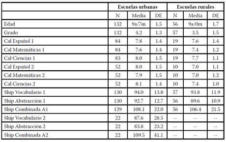 Al comparar los puntajes de la Shipley por la ubicación de la escuela en que estudian los alumnos, se encontró que son muy parecidos, todos se ubican en la categoría “promedio” en escuelas urbanas y rurales. Hubo una disminución en los puntajes de los alumnos de escuelas urbanas (sus puntajes en Vocabulario y Abstracción se ubican “por debajo del promedio” y en la Escala Shipley Combinada A en el promedio), y se desconocen los posibles cambios de los alumnos de escuelas rurales, pues no se pudieron evaluar.