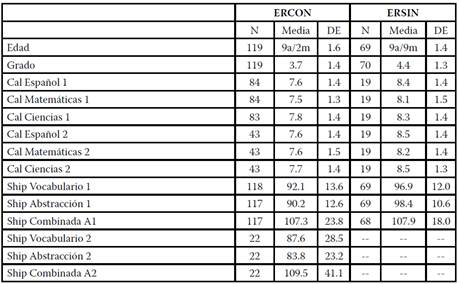 En la Tabla 4, que muestra las calificaciones y las respectivas puntuaciones de la Shipley de alumnos de ERCON y ERSIN, se podrá apreciar que las calificaciones de los alumnos que estudian en ERSIN obtienen calificaciones iniciales y finales más altas que los de ERCON en las tres áreas evaluadas. En la Shipley, estos mismos estudiantes de ERSIN obtienen puntajes muy parecidos a los de las ERCON. Solamente los puntajes de abstracción de los alumnos de ERSIN resultaron significativamente más altos (t= -3.68, gl= 84, p≤ .000).