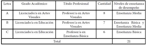 Según Tabla 1, los/las profesores/as entrevistados/as corresponden a un total de 21 profesionales de la educación. Cuyo perfil de formación y niveles de enseñanza en los cuales se desempeñaron, evidencian diferentes grados académicos y títulos profesionales que permiten a cada profesional ejercer como profesor/a en la asignatura de artes visuales en niveles de enseñanza en el sistema escolar chileno.