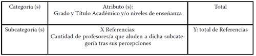 Para ello, se distinguió en primer lugar los atributos a raíz de grados, títulos y niveles de desempeño profesional, en segundo lugar, se determinaron categorías y subcategorías según información recolectada mediante entrevista aplicada de forma individual a cada profesor/a: