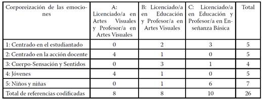 La corporeización de las emociones como categoría principal entrelaza el binomio cuerpo/mente, y se asocia libre y abiertamente a la luz de las percepciones emanadas del conjunto de relatos recolectados en las entrevistas. A su vez, emergen 5 subcategorías entorno a dicha categoría principal, las cuales evidencian la activación de las emociones mediante el cuerpo articulado con la mente: 1) centrado en el y la estudiante, 2) centrado en la acción docente, 3) cuerpo-sensación y sentidos, 4) jóvenes, 5) niños y niñas. Subcategorías a las cuales se adscriben un total de 26 referencias según los atributos relacionados con el grado académico y título profesional de profesores/as, según Tabla 3.