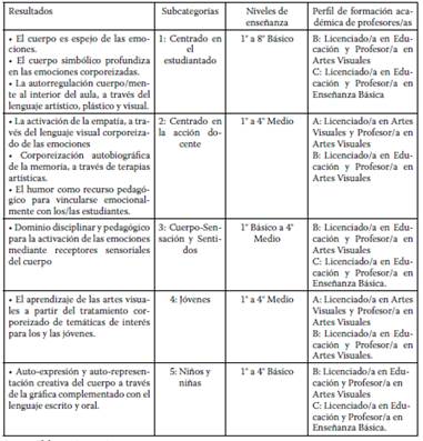En primer lugar, en términos generales se evidencia un correlato entre los modos de activación de emociones corporeizadas, según el nivel de enseñanza y el perfil del profesorado entrevistado que imparte la asignatura de artes visuales en el sistema escolar chileno. En el primer ciclo de enseñanza general básica se distingue la capacidad de centrar el aprendizaje artístico en niños y niñas, particularmente por parte de Licenciados/as en Educación y Profesores/as en enseñanza general básica. En los niveles de enseñanza media se identifica el despliegue de estrategias didácticas a partir de humor, identidad, resolución de conflictos por parte de Licenciados/as en Artes Visuales y Profesores/as en Artes Visuales. Mientras que, entre el segundo ciclo de enseñanza básica y enseñanza media, el tratamiento disciplinar e interdisciplinar de los contenidos, junto al dominio de conocimientos pedagógicos, es activado por Licenciados/as en Educación y Profesores/as en Artes Visuales producto de la especificidad de su formación disciplinar.