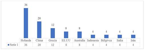 De total de 25 trabajos analizados, se encontró que el 60% fueron realizados en el contexto europeo. Los países de origen de las muestras más frecuentes fueron Holanda (36%) y China (20%) (Ver Figura 2).