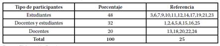 De las 25 investigaciones analizadas, se encontró que los estudios contaron con muestras mayormente tendientes al rango entre 100 y 1000 personas (n=16, 64%). Las proporciones de participantes por rango fueron: menos de 100 participantes (n=2, 12%), entre 101-500 participantes (n=7; 28%), entre 501-1000 participantes (n=9; 36%) y más de 100 participantes (n=6, 24%). Al comparar los tipos de muestras, se observa que en su mayoría los estudios utilizaron estudiantes (n=12; 48%); algunos estudios incluyeron docentes y estudiantes (n=8; 32%) y muy pocos (n= 5; 20%) utilizaron sólo docentes (Ver Tabla 1).