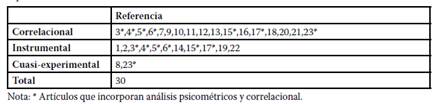 Del total de los 25 artículos 17 utilizaron un diseño correlacional; 11 utilizaron un diseño instrumental y 2 de los estudios utilizaron un diseño cuasi-experimental (Ver Tabla 2).