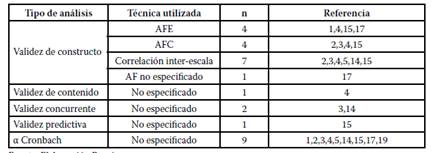 1) Se utilizaron variadas pruebas para la medida de validez, donde la más predominante fue el análisis de la correlación inter-escala (60%), el Análisis Factorial Exploratorio (AFE) (40%) y el Análisis Factorial Confirmatorio (AFC) (30%).