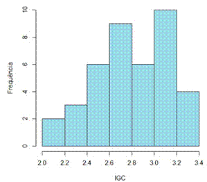 Considerando la estadística descriptiva, para la variable ITCD se obtuvo un promedio de 3.99 y una desviación estándar de 0.24, resultando en un coeficiente de variación de aproximadamente 6%, indicando baja variabilidad en las observaciones de la muestra, de acuerdo a la clasificación propuesta por Gomes (1985)3. En cuanto a la variable IGC, la media fue de 2.8 y la desviación estándar de 0.33, lo que da como resultado un coeficiente de variación de aproximadamente el 12%, que a su vez recibe una calificación promedio. Las figuras 1 y 2 muestran las distribuciones de frecuencia de estos indicadores.