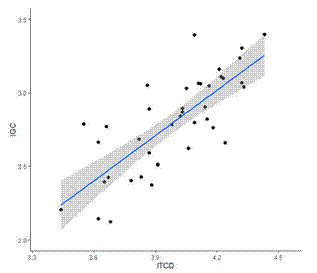 En resumen, estos resultados indican que el modelo es adecuado para evaluar el comportamiento de la variable respuesta, considerando las fluctuaciones de la variable predictora y, en consecuencia, que se puede interpretar el análisis de regresión. Así, según el modelo propuesto, para un incremento de una unidad en el indicador ITCD, que indicaría un incremento, en promedio, de un nivel en los títulos de los docentes analizados, se estima un incremento promedio de 1.0274 en el IGC de la unidad.