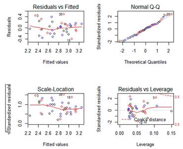 El gráfico Residuals vs Fitted de dispersión entre los residuos y los valores estimados, para evaluar los supuestos de linealidad entre las variables;