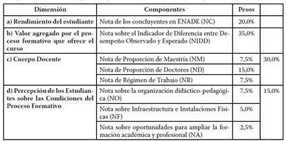 Teniendo en cuenta la graduación, el IGC utiliza, como instrumento de evaluación de la calidad, el Concepto Preliminar de Curso (CPC). De acuerdo con la Nota Técnica Nº 58/2020/ CGCQES/DAES, el CPC es un indicador primario que consta de ocho componentes que se agrupan en cuatro dimensiones (Ministério da Educação e Cultura, 2020b). Esta composición y los respectivos pesos asignados a sus dimensiones y componentes se describen en la Tabla 1.