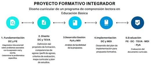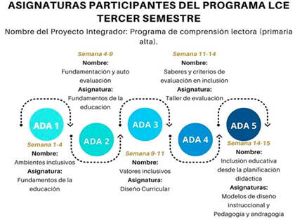 La intervención se llevó a cabo en el período agosto-diciembre de 2021; el proyecto formativo integrador (PFI) que se realizó en dicho período estuvo orientado a la docencia y consideró las cinco asignaturas vinculadas al mismo: Fundamentos de la Educación, Diseño curricular, Taller de evaluación, Modelos de diseño instruccional y Pedagogía y Andragogía. Como resultado de este proyecto, el alumnado debía elaborar un diseño curricular. La relación de estas asignaturas con el PF se muestra en la Figura 1. El PFI estuvo guiado por el profesorado y consistió en una propuesta de diseño curricular sobre un programa de comprensión lectora en Educación Básica, específicamente para el nivel de primaria alta (4°, 5° y 6° grados). Es importante señalar que las autoras no tuvieron injerencia en la elección de este programa, ya que fue decisión de la institución educativa y la academia de docentes.