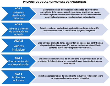 Las actividades de aprendizaje 1, 2 y 3 abordaron aspectos que llevaron al alumnado a conocer, reflexionar y fundamentar la importancia de los valores y el establecimiento de ambientes inclusivos durante el aprendizaje, mientras que las ADAs 4 y 5, con base en las etapas del PFI, permitieron poner en práctica los conocimientos adquiridos acerca de ambos indicadores, los cuales se vieron reflejados en la evaluación y planificación de los diseños instruccionales.