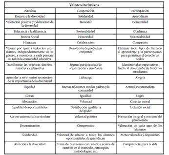 Se entiende por valores inclusivos el “conjunto de visiones, ideas, concepciones y creencias que están en concordancia con la buena educación como bien y derecho para todos” (Arnaiz y Guirao, 2015, p. 73).