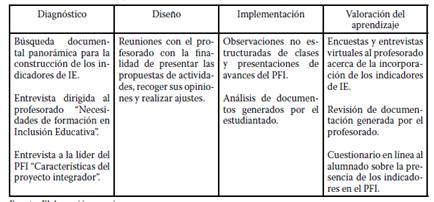 La recolección de la información estuvo en función de las cuatro fases antes descritas, las cuales incluyeron las actividades que se muestran en la Tabla 1. Durante la fase de diagnóstico se realizaron tres entrevistas; en la fase de diseño, se llevaron a cabo nueve reuniones con los diferentes profesores de las asignaturas participantes. Posteriormente, el seguimiento dado durante la etapa de la implementación requirió de tres observaciones, una en la fase inicial del PFI, otra durante la construcción del mismo, y otra más durante la fase final del PF. Por último, en la fase de valoración del aprendizaje se administró un cuestionario en línea al alumnado, tres entrevistas al profesorado de MDI, Taller de evaluación (TEVA), Pedagogía y andragogía (PyA), así como dos encuestas al profesorado de diseño curricular (DC y Fundamentos de la Educación (FE).