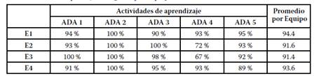 Se pidió al profesorado de cada asignatura valorar los resultados de las ADAs, para ello se establecieron cuatro niveles de logro: no se logró (0-50 %), se logró parcialmente (51-70 %), se logró sustancialmente (71-90 %) y se logró totalmente (91-100 %). En la Tabla 2 se muestran las ponderaciones emitidas por el profesorado de cada asignatura ante el trabajo de los diferentes equipos participantes, así como el promedio obtenido por cada uno de ellos.