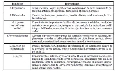 Cabe mencionar que a través de la incorporación y valoración del aprendizaje en torno a los indicadores de IE, se destaca la relevancia del papel del profesorado formador para el logro de la transversalización de los mismos, así como la reflexión y aplicación por parte del estudiantado como forma de verificar el impacto en el proceso de aprendizaje con respecto al PFI desarrollado. De modo que, con los elementos del currículo considerados en esta intervención, aunado a la participación activa del profesorado y estudiantado, es posible lograr una formación para el logro de la IE desde la formación profesional docente.
