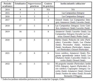 El siguiente texto presenta la actualización del Eje de formación práctica del departamento de educación parvularia de la Universidad de Atacama, nacido en respuesta a los contextos socioculturales emergentes del nuevo milenio, que llaman a la mejora constante, así como a la ampliación de su sentido y propósito. En su construcción se han incorporado varios elementos formativos que tributan al componente curricular distintivo declarado por la carrera de pedagogía en educación parvularia: “Educar a través de la emoción”, el cual tiene como principal propósito: “(…) el desarrollar en las estudiantes competencias profesionales relacionadas a la potenciación del desarrollo socioemocional del párvulo y la generación de ambientes bien tratantes (…) (Lería Dulčić et al., 2019, p. 2). Desde los comienzos de la conducción de esta iniciativa la misma ha sido enriquecida año tras año hasta el periodo académico 2017, momento en el cual se decidió realizar una evaluación integral a razón de la renovación del plan de estudio a una malla semestral y otros ajustes menores de mejora.